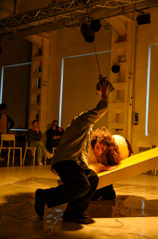 Greetings from the Void investigates the relationship between human presence, objects and environment by interweaving choreography and installation, to give voice to the feeling of existential uncertainty and disorientation that characterises our age. The choreography evolves in real time in parallel with the sound and light landscape that emerges from the choreography itself and informs its progression. Each movement creates sound fragments, recorded and transformed into a dynamic musical ecosystem. This sensory environment, in which light and sound interact, gives rise to a narrative rich in potential meanings. The work invites one to confront the idea of the possibility of radical freedom; is it possible to accept the absence of universal meaning and fully embrace the responsibility to create one's own meaning?